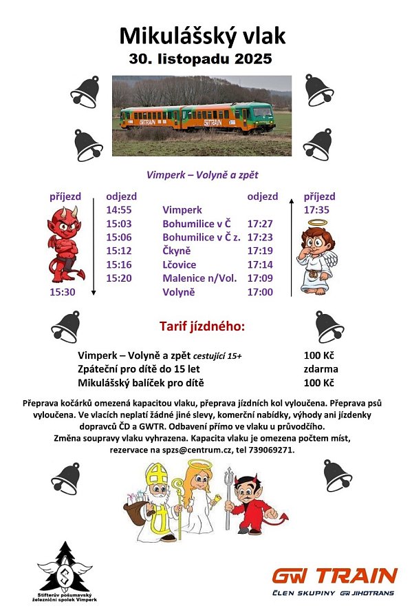 Zvláštní vlak Vimperk–Volyně a zpět s mikulášskou nadílkou. Nutná rezervace na tel: 739069271.