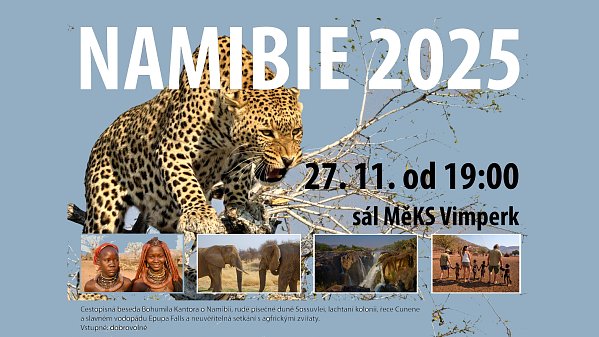 Cestopisná beseda Bohumila Kantora o Namibii, rudé písečné duně Sossuvlei, lachtaní kolonii, řece Cunene a slavném vodopádu Epupa Falls a neuvěřitelných setkání s agfrickými zvířaty.